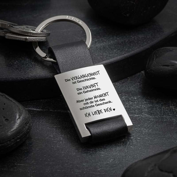 Zeige deinem Partner und Lieblingsmensch mit diesem stilvoll gearbeiteten Schlüsselanhänger, das er für dich die Welt bedeutet! Die aufgebrachte Lasergravur transportiert deine liebevolle Botschaft: "Die Vergangenheit ist Geschichte. Die Zukunft ein Geheimnis. Aber jeder Moment mit dir ist das schönste Geschenk. Ich liebe dich."
