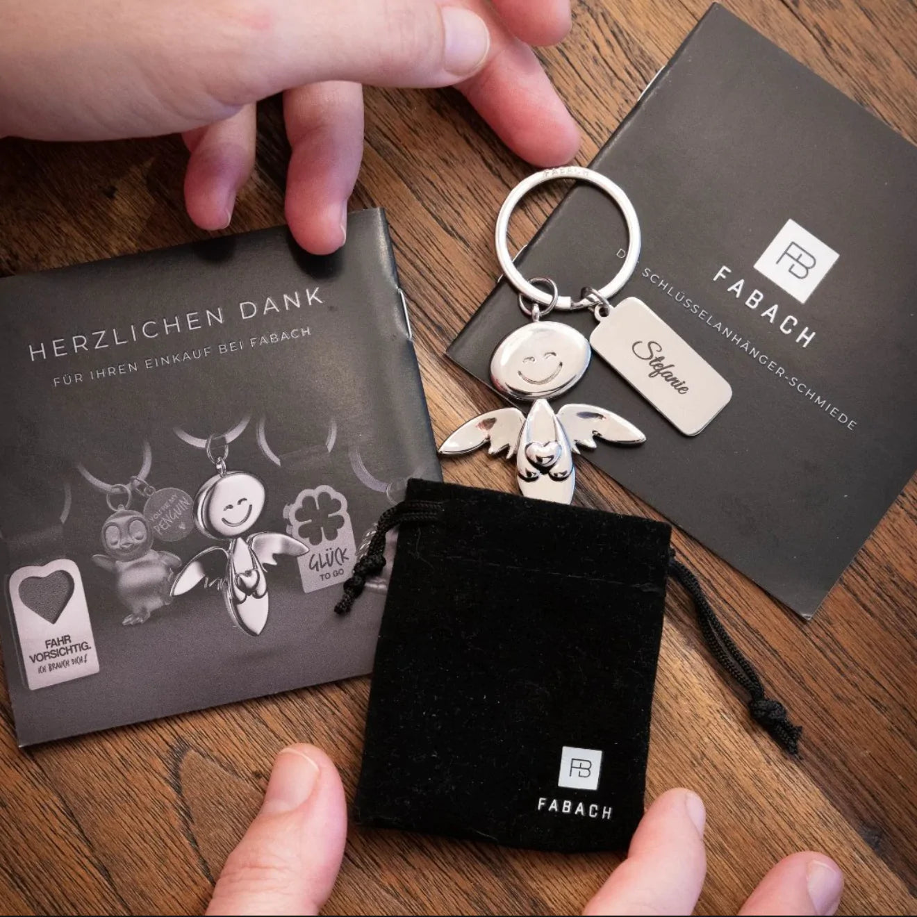 From our best-selling products such as the guardian angel keychain "Happy" and the owl keychain "Owly" to high-quality leather heart keychains - we offer a large selection of personalized engraving products.