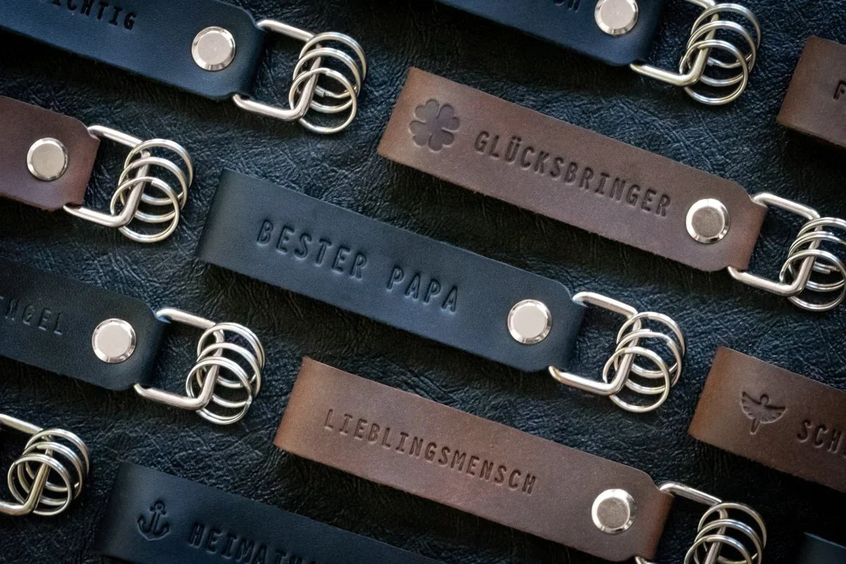 For our keychains, high-quality leather was selected before production and then hand-finished in several steps. The applied leather embossing completes your personal gift with a meaningful message.